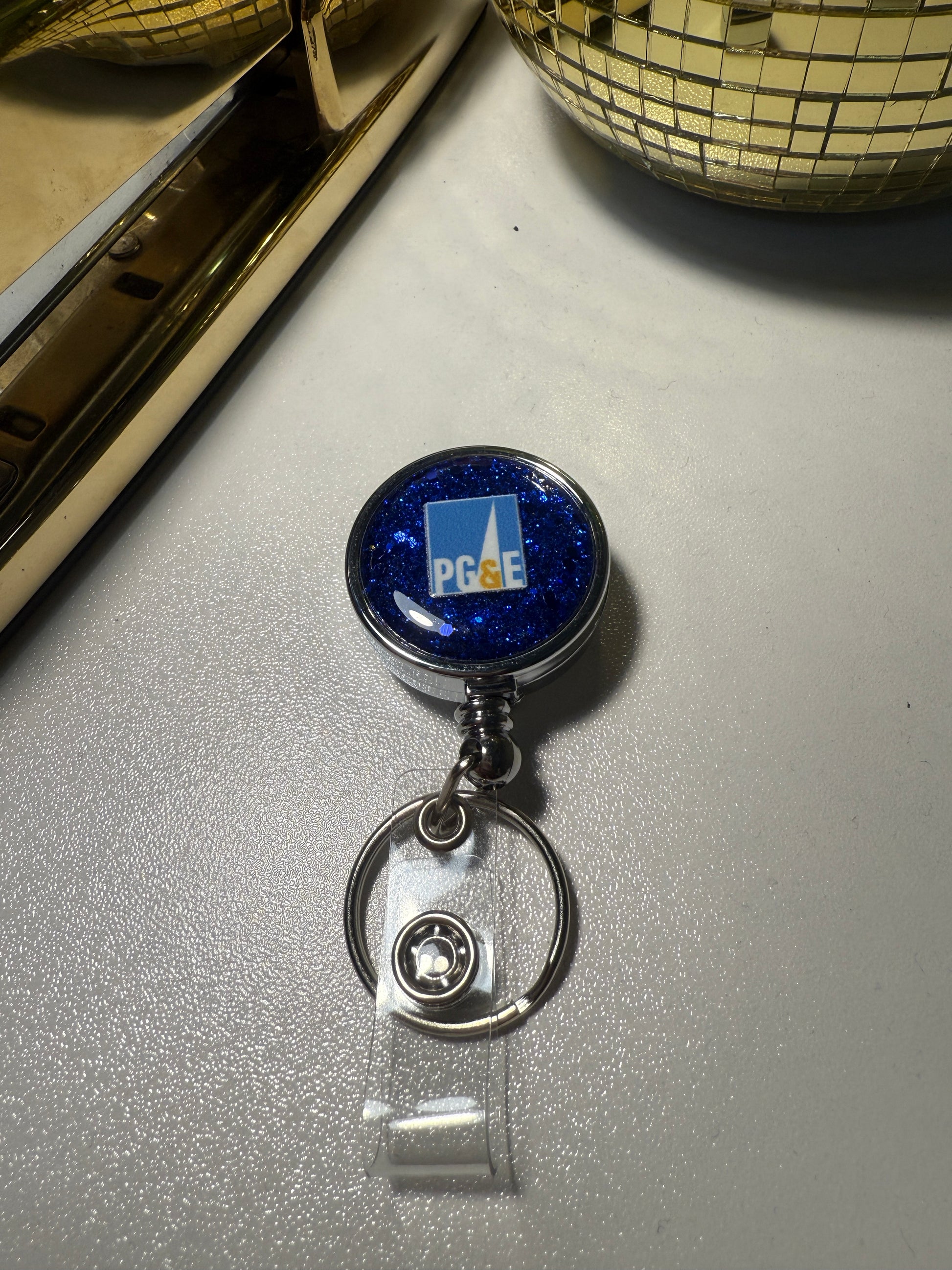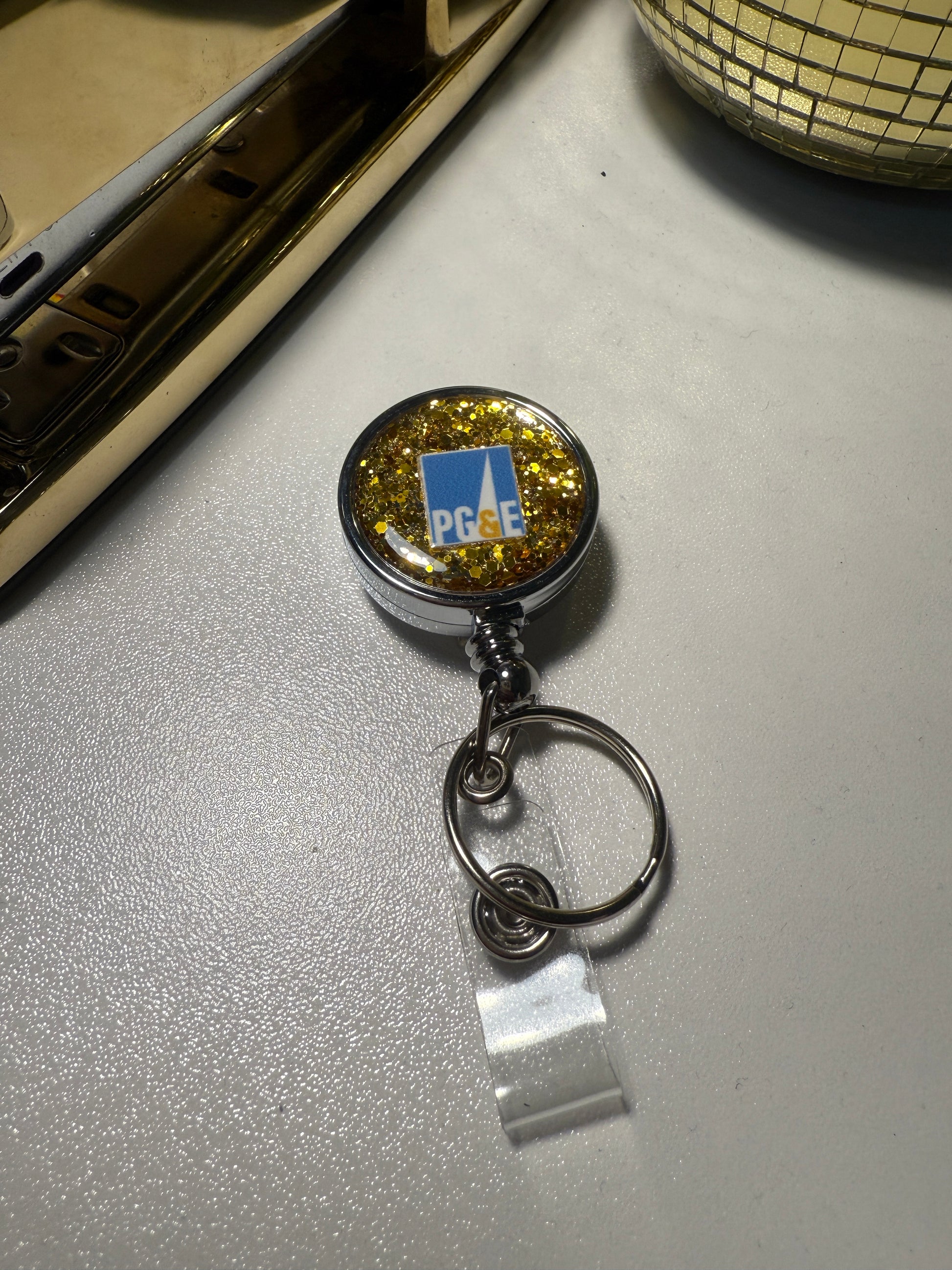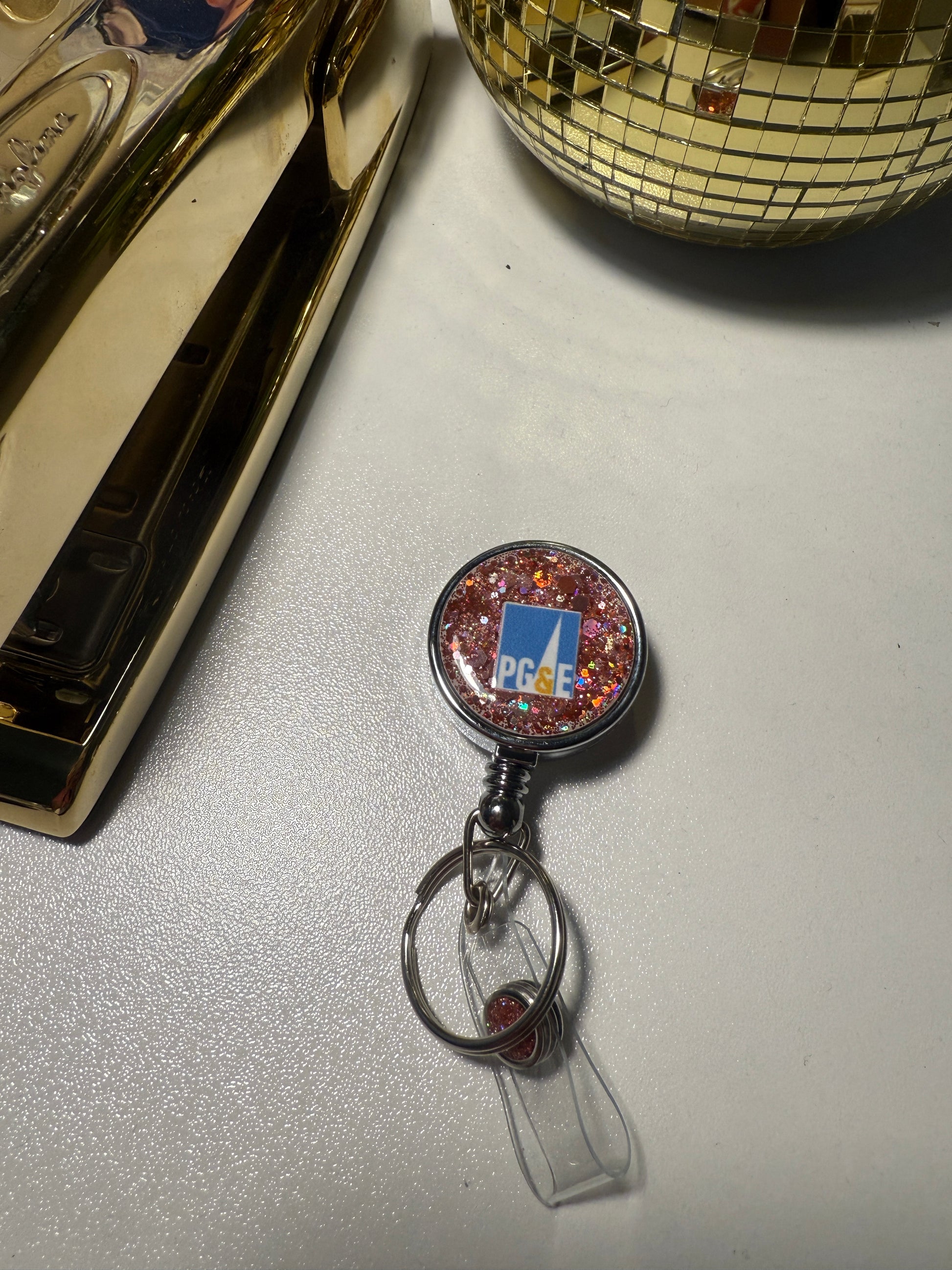 Badge reel with clip for pants. Some of the badge reels have a glitter button and others don't. We send out what we have at the time